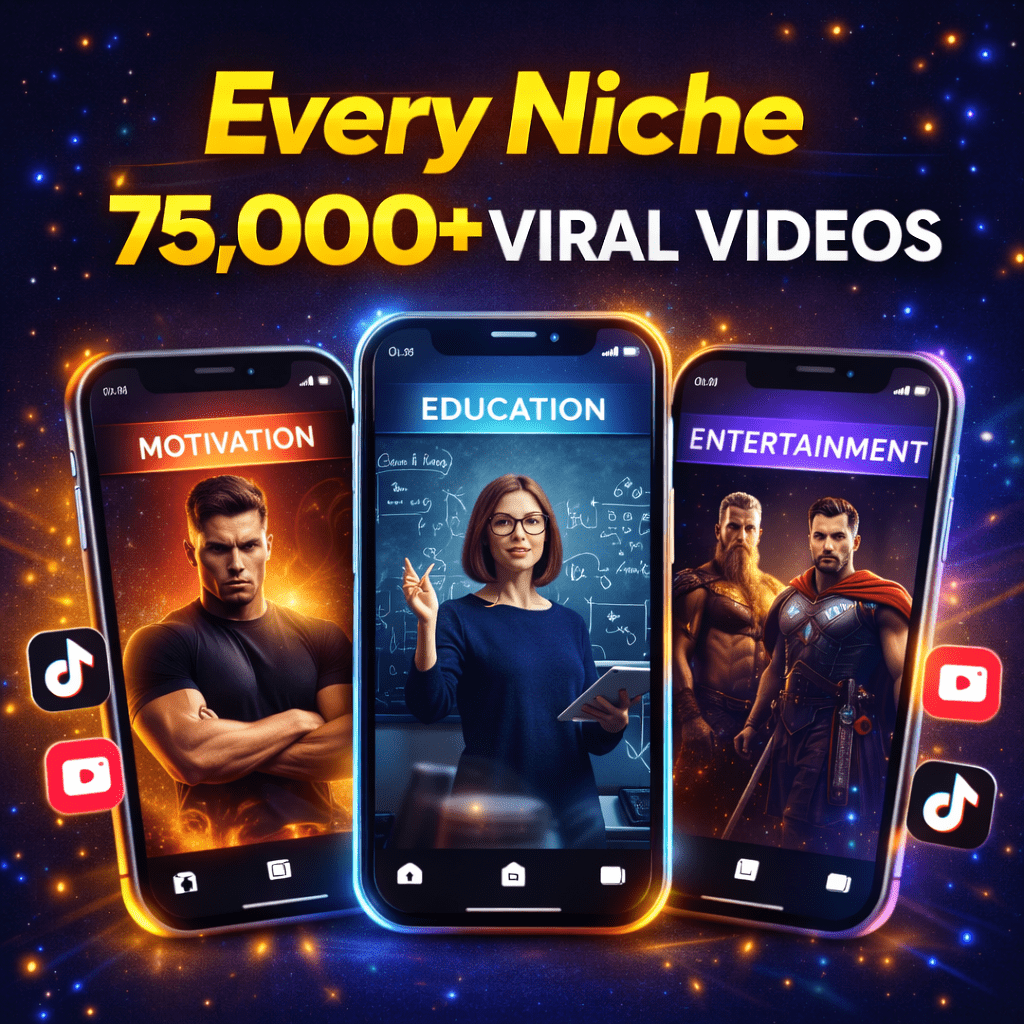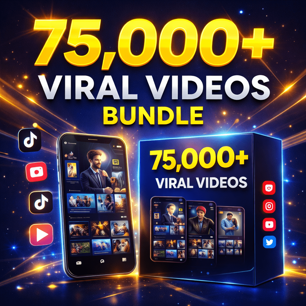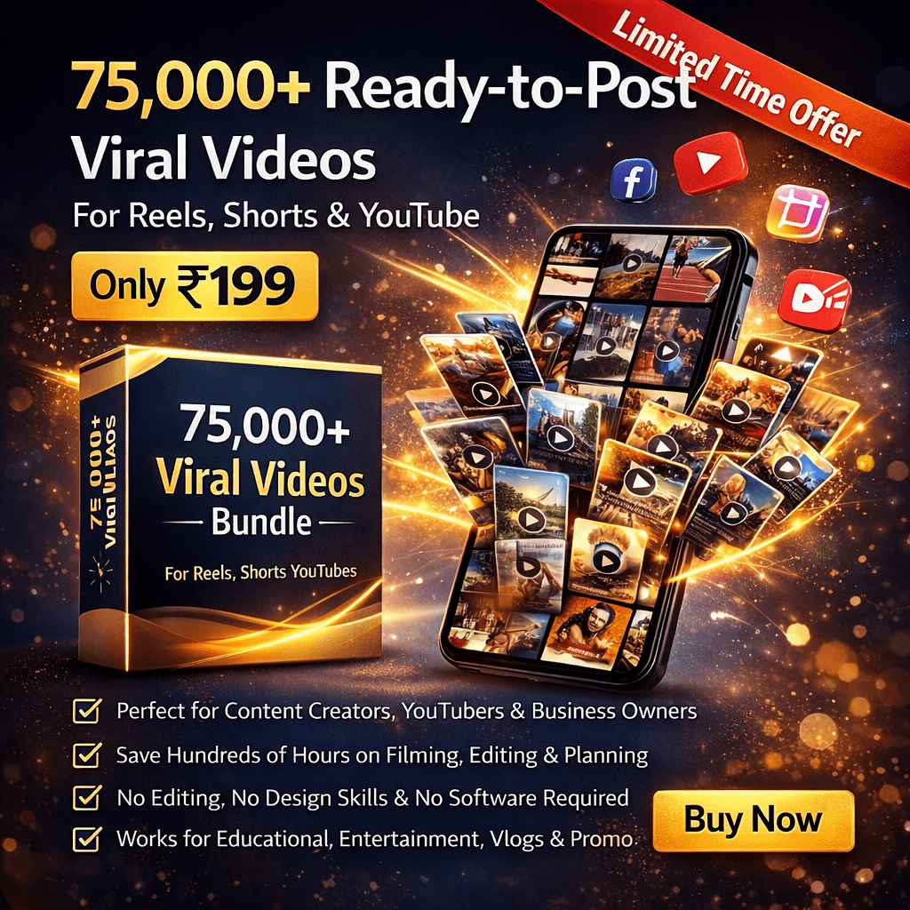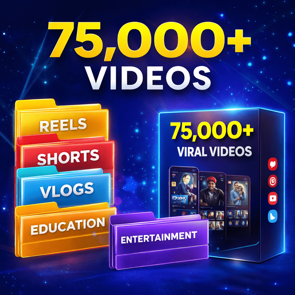 You will get instant access to the 75,000+ Viral Videos Bundle, which includes ready-to-post videos for Reels, Shorts, YouTube, Facebook, education, entertainment, motivation, and more — all in organized folders for easy use.